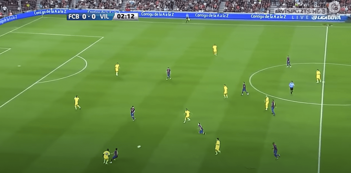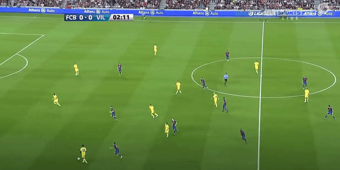 Anche nel contropressing orientato al passaggio l’avversario sarà anche messo sotto pressione da un giocatore, ma qui, come nella versione orientata all’uomo, verrà “messo in condizione” di effettuare il primo passaggio. A differenza della riaggressione orientata all’uomo, tuttavia, non verrà attaccato il ricevitore del passaggio, ma il passaggio stesso. L’obiettivo è quello di posizionarsi tra alcuni avversari e poi, dopo che la palla è stata passata, recuperare la palla in modo flessibile, intercettando il passaggio o, nel caso in cui non fosse possibile, pressare il ricevitore da due giocatori. Il Barcellona ha usato spesso questo stile negli anni di Pep Guardiola. Per una migliore comprensione consiglio la visione di questo video su Youtube, non pubblicabile per diritti appartenenti a LaLiga.