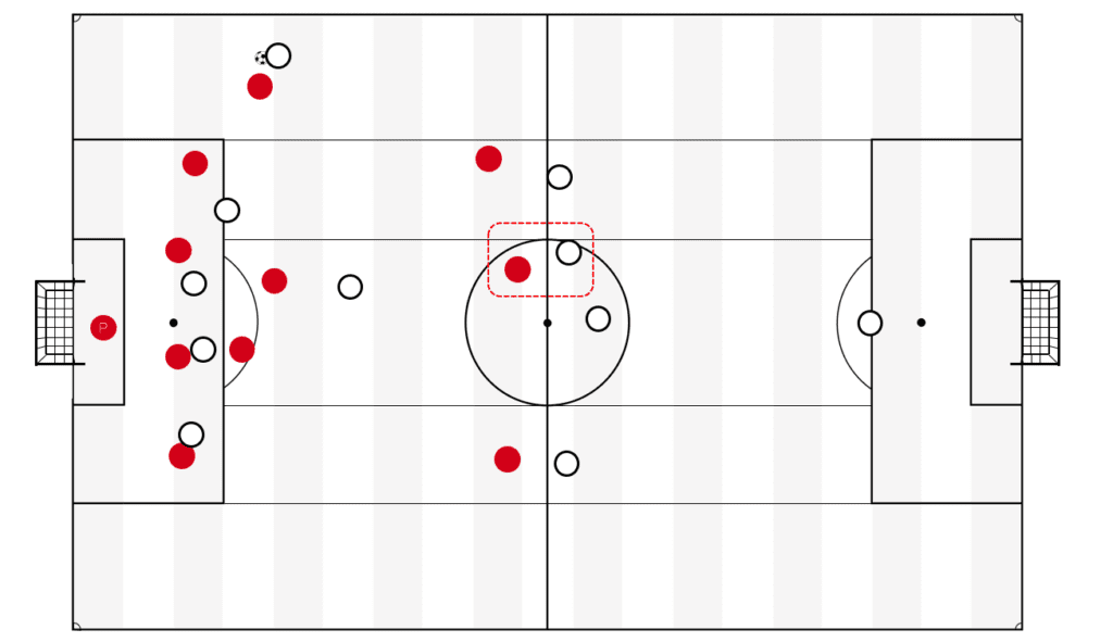 La seconda opzione potrebbe invece prevedere un posizionamento dell’attaccante centrale più alto, con l’effetto di appiattire la struttura difensiva e creare un ampio spazio aperto a centrocampo. Questo sembrerebbe essere meno vantaggioso per creare contrattacchi diretti, poiché i difensori sono in grado di mantenere una superiorità numerica difensiva di 4 contro 3 nell’ultima linea. Tuttavia, può essere utile per mantenere il possesso, poiché il giocatore che si trova nella posizione più ideale per applicare il contropressing diretto è costretto ad effettuare una corsa all’indietro. Inoltre, si tratta di uno spazio che può essere utilizzato dai centrocampisti per uscire dalla zona di riconquista ed eludere la pressione avversaria avanzando in avanti.