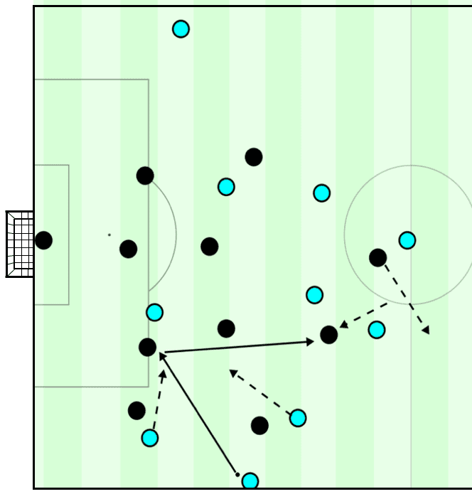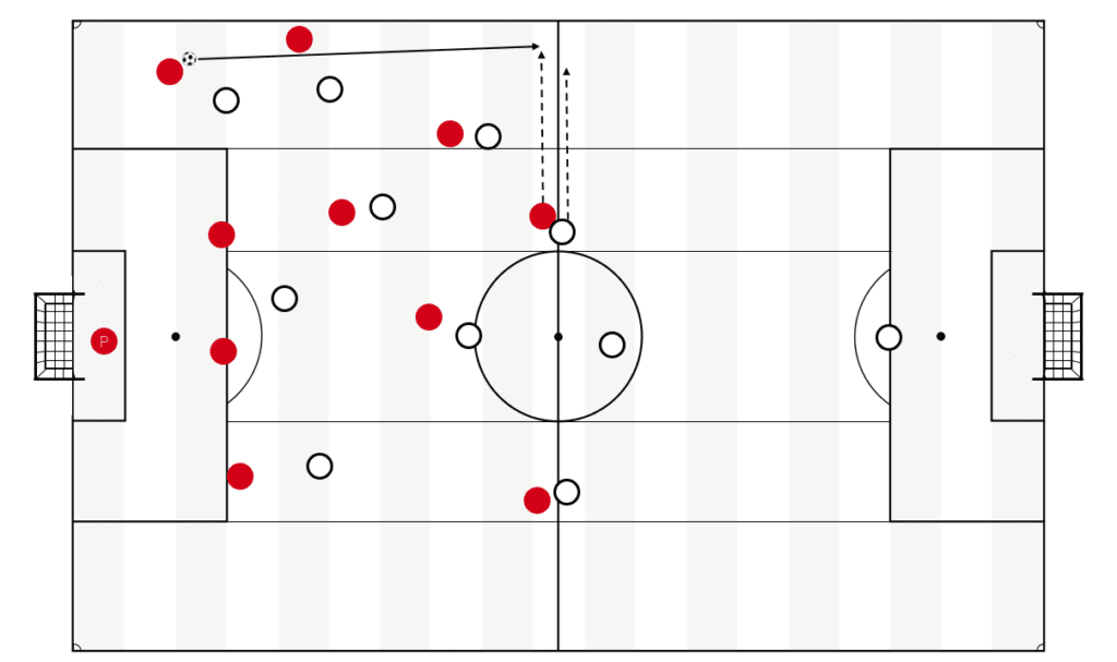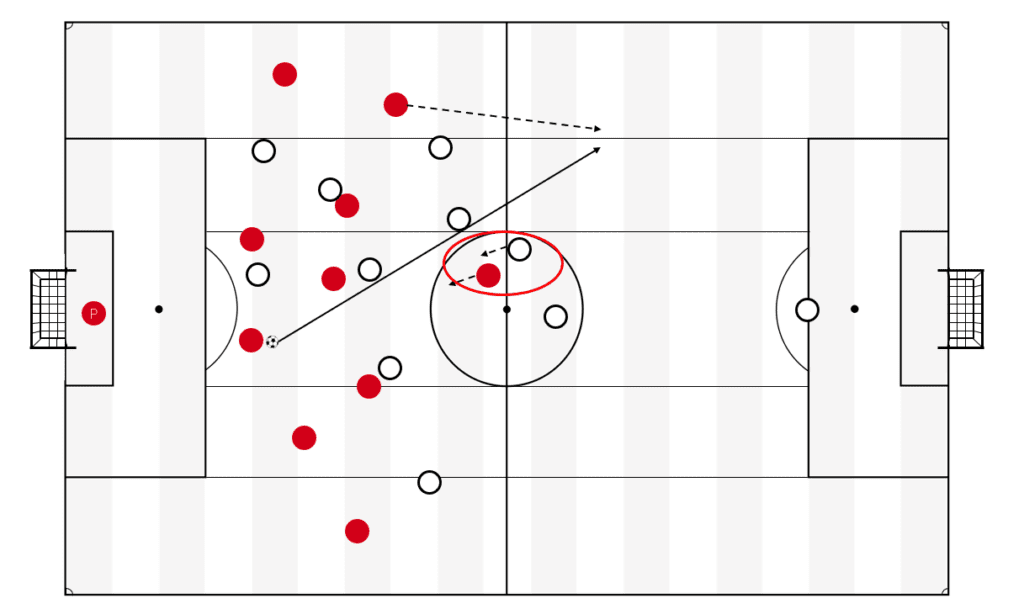 Ancora, un terzo modo è quello di far muovere l’attaccante dopo la riconquista della palla nello spazio aperto sulla fascia. Il vantaggio principale di questo aspetto è rappresentato dal fatto che molto probabilmente il suo movimento trascinerà con sé il difensore centrale di parte, aprendo spazi al centro e dilatando probabilmente gli spazi della difesa preventiva. Quando si ha a disposizione un attaccante forte fisicamente e con buone proprietà tecniche individuali che lo rendono in grado di reggere palla in una situazione di uno contro uno dorsale, questa soluzione può essere un’opzione da utilizzare nel caso in cui gli avversari siano in grado di mettere pressione alla propria squadra e il contropiede deve quasi necessariamente essere iniziato attraverso una palla lunga.