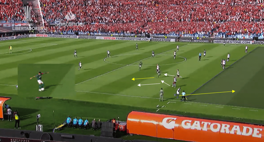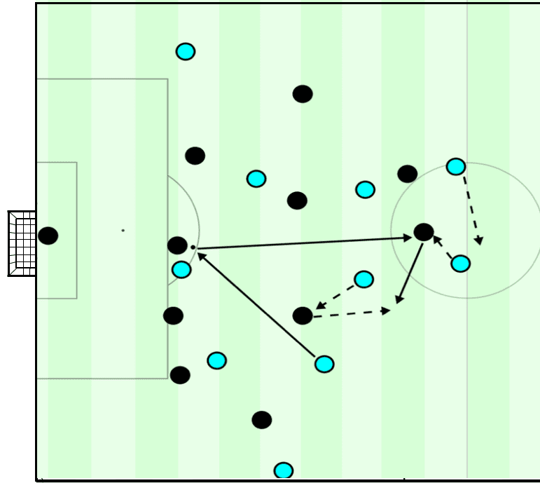 In questa situazione appena descritta, l’Argentina stava mantenendo una struttura preventiva 2+3, formata da 2 difensori e 3 centrocampisti. Contro una struttura di questo tipo può essere utile creare un sovraccarico di 2 contro 1 “mettendo in mezzo” il centrocampista centrale, per esempio, al fine di creare un giocatore libero per avanzare in contropiede. Questa superiorità numerica può essere creato in diversi modi: attraverso l’abbassamento di un attaccante oppure, come nel caso di cui sopra, attraverso lo smarcamento di uno dei giocatori posizionati sopra la linea della palla sul lato cieco di un difensore per ricevere la palla.