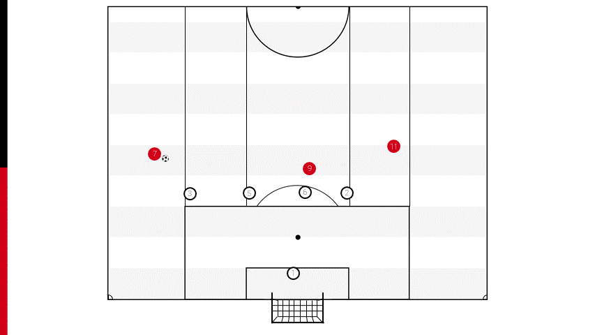 Continuiamo a prendere in esame l’esempio dell’esterno d’attacco che converge per attaccare la linea difensiva a quattro. Se, a differenza del caso precedente, l’attaccante si posiziona sul secondo centrale, ci sarà un momento in cui il movimento con la palla dell’esterno sarà preso in carico dal primo centrale, con il terzino che invece, lascerà la marcatura per non farsi portare troppo fuori posizione dall’avversario. In questo caso si genererà uno spazio alle sue spalle che potrà essere sfruttato dall’attaccante per ricevere palla partendo dal lato cieco del proprio marcatore.
