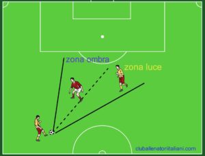 Ogni difendente determina dietro di sè, nei confronti della palla, uno spazio vicino e ristretto entro il quale è difficile per un avversario ricevere palla. Tale spazio viene definito zona ombra, perchè può essere coperto e protetto anticipatamente in ampiezza e profondità. Il difensore potrà quindi intervenire sulla palla diventando “ombra” per un avversario poichè in quello spazio difficilmente riuscirà ad entrare in possesso della palla.