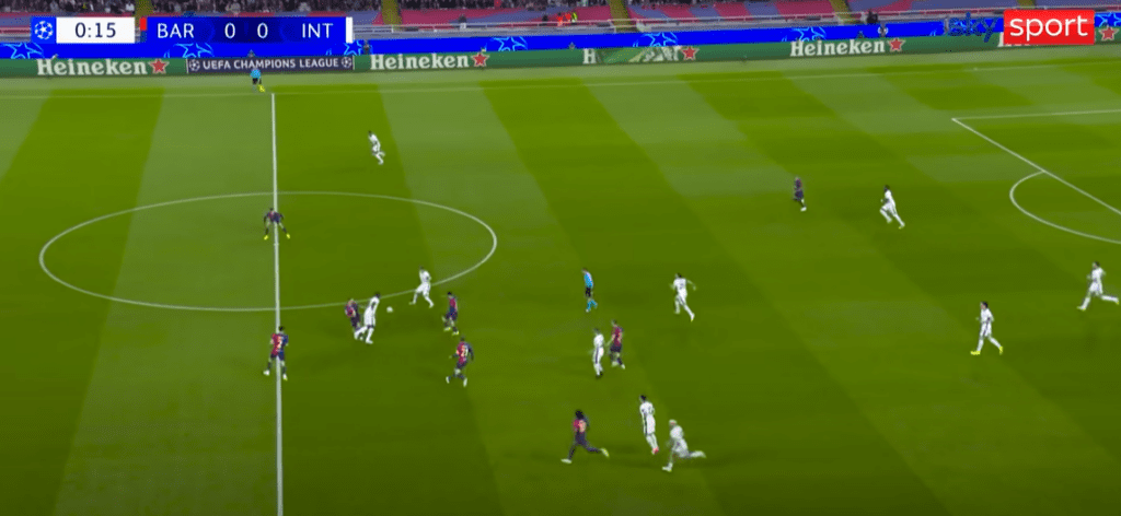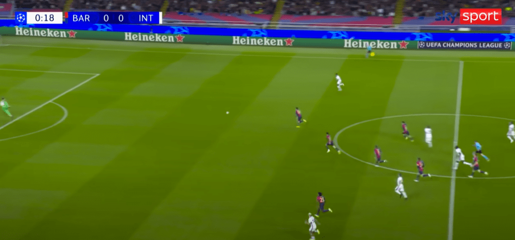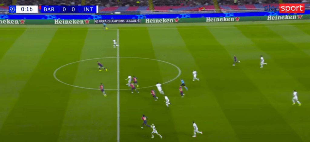 I vantaggi difensivi del “lato cieco” possono essere utilizzati a proprio favore anche nel caso di una pressione maggiormente indirizzata sull’uomo a tutto campo. Avvicinarsi al portatore di palla dal suo lato cieco è infatti un metodo potenzialmente molto efficace. Basti pensare al primo gol segnato dall’Inter nella semifinale di ritorno di Champions League giocata ieri contro il Barcellona.