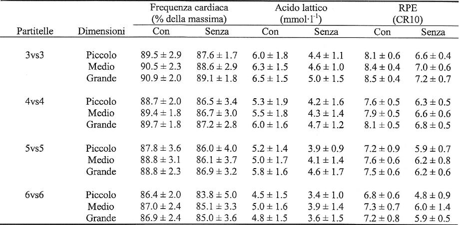 L’analisi statistica effettuata rivela che il 3vs3 è risultato più intenso del 4vs4 e del 5vs5, mentre tutte e tre queste esercitazioni sono risultate essere più intense del 6vs6. E’ stato inoltre verificato un effetto significativo delle dimensioni del campo di gioco utilizzato sulla frequenza cardiaca dell’esercizio, sulla concentrazione di lattato accumulato e sulla percezione dello sforzo (RPE).